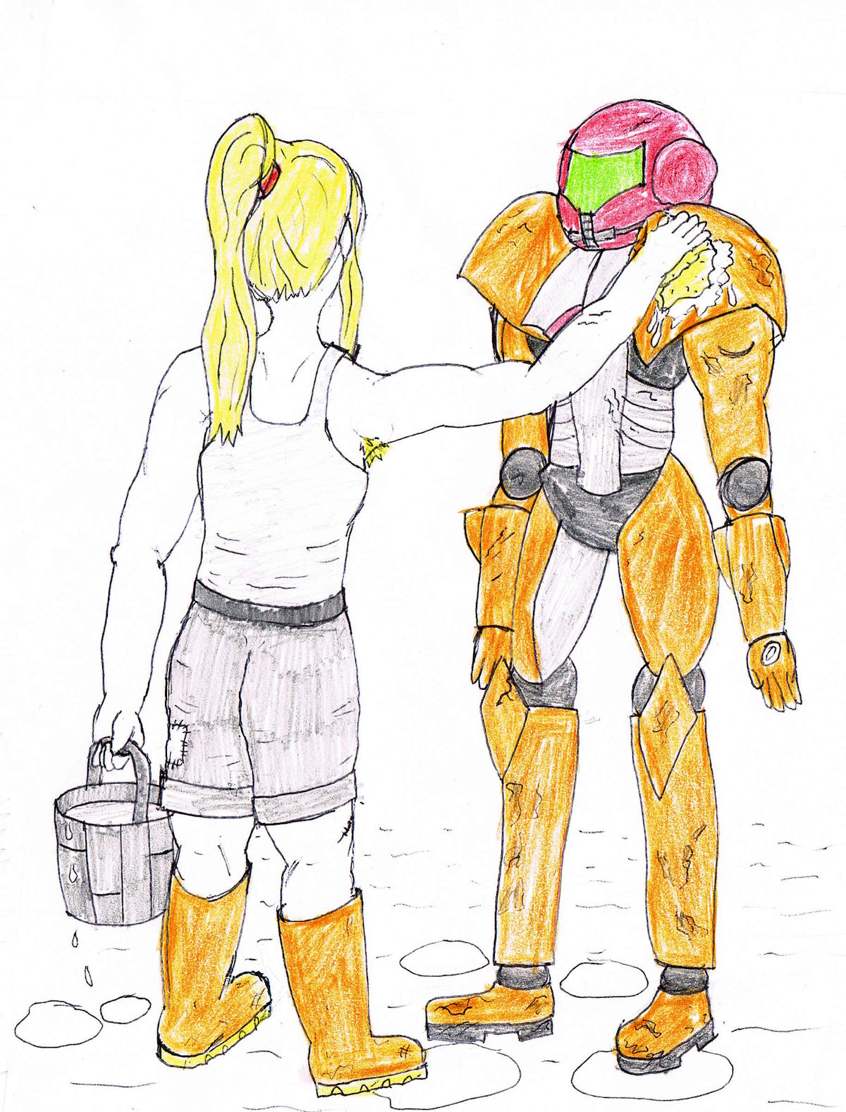 Samus Aran washing her power suit, which she does on a loose schedule of "whenever it looks dirty". Usually, there's more blue fungal clay, viscous two-coloured alien blood and mellified essence of Kraid.